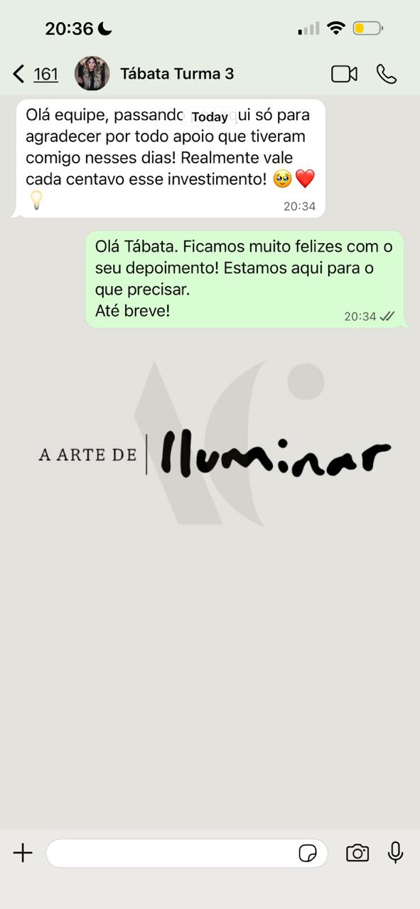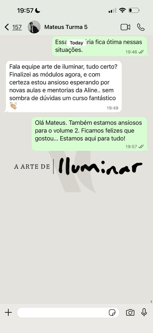 Ao adquirir o conteúdo “A Arte de Iluminar”, o usuário declara estar ciente de que seu desempenho profissional depende exclusivamente de sua própria aplicação, comprometimento e atuação no mercado.
