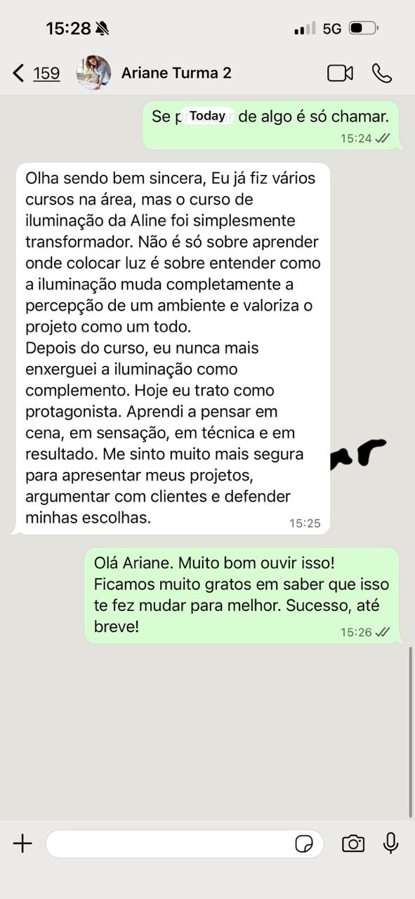 Ao longo dessa jornada, Aline já contribuiu para a realização de centenas de projetos luminotécnicos, acompanhando obras e orientando arquitetos e clientes na tomada de decisões técnicas e estéticas. Agora, por meio do curso A Arte de Iluminar, ela direciona toda essa experiência para guiar você em um caminho de crescimento consistente e evolução profissional.